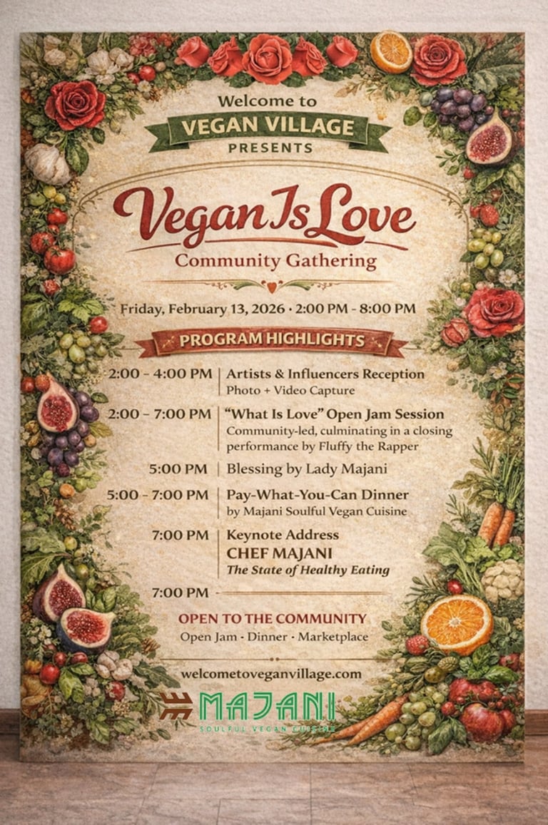 Chicago, IL | In the wake of several vegan business closures across Chicago in 2025, Welcome to Vegan Village is proud to announce a community-centered revival event: Vegan Is Love with Chef Majani, paired with the “What Is Love” EP Release Party by Fluffy the Rapper, brings together food, music, wellness, and creative expression in one shared space.