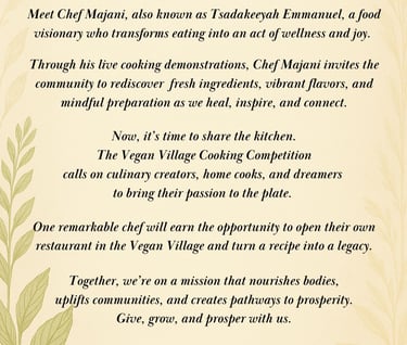 Vegan Village isn’t just about eating plants, it’s about planting hope. We’re building a self-sustaining ecosystem that feeds people, funds small businesses, and fosters creativity, right in the heart of communities too often left behind.